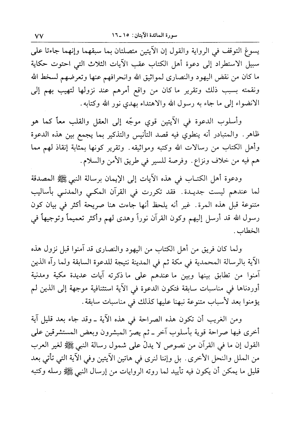 ودعوة أهل الكتاب في هذه الآيات إلى الإيمان برسالة النبي صلى الله عليه وسلم المصدقة لما عندهم ليست جديدة. فقد تكررت في القرآن المكي والمدني بأساليب متنوعة قبل هذه المرة. غير أنه يلحظ أنها جاءت هنا صريحة أكثر في بيان كون رسول الله قد أرسل إليهم وكون القرآن نورا وهدى لهم وأكثر تعميما وتوجيها في الخطاب.