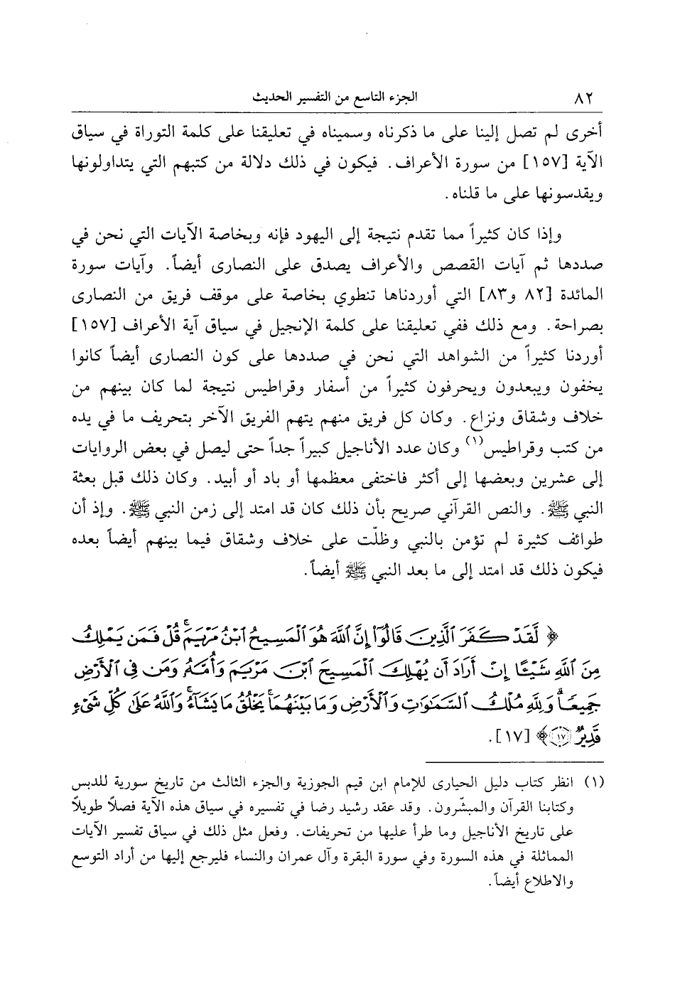 (1) انظر كتاب دليل الحيارى للإمام ابن قيم الجوزية والجزء الثالث من تاريخ سورية للدبس وكتابنا القرآن والمبشّرون. وقد عقد رشيد رضا في تفسيره في سياق هذه الآية فصلا طويلا على تاريخ الأناجيل وما طرأ عليها من تحريفات. وفعل مثل ذلك في سياق تفسير الآيات المماثلة في هذه السورة وفي سورة البقرة وآل عمران والنساء فليرجع إليها من أراد التوسع والاطلاع أيضا. [.....]