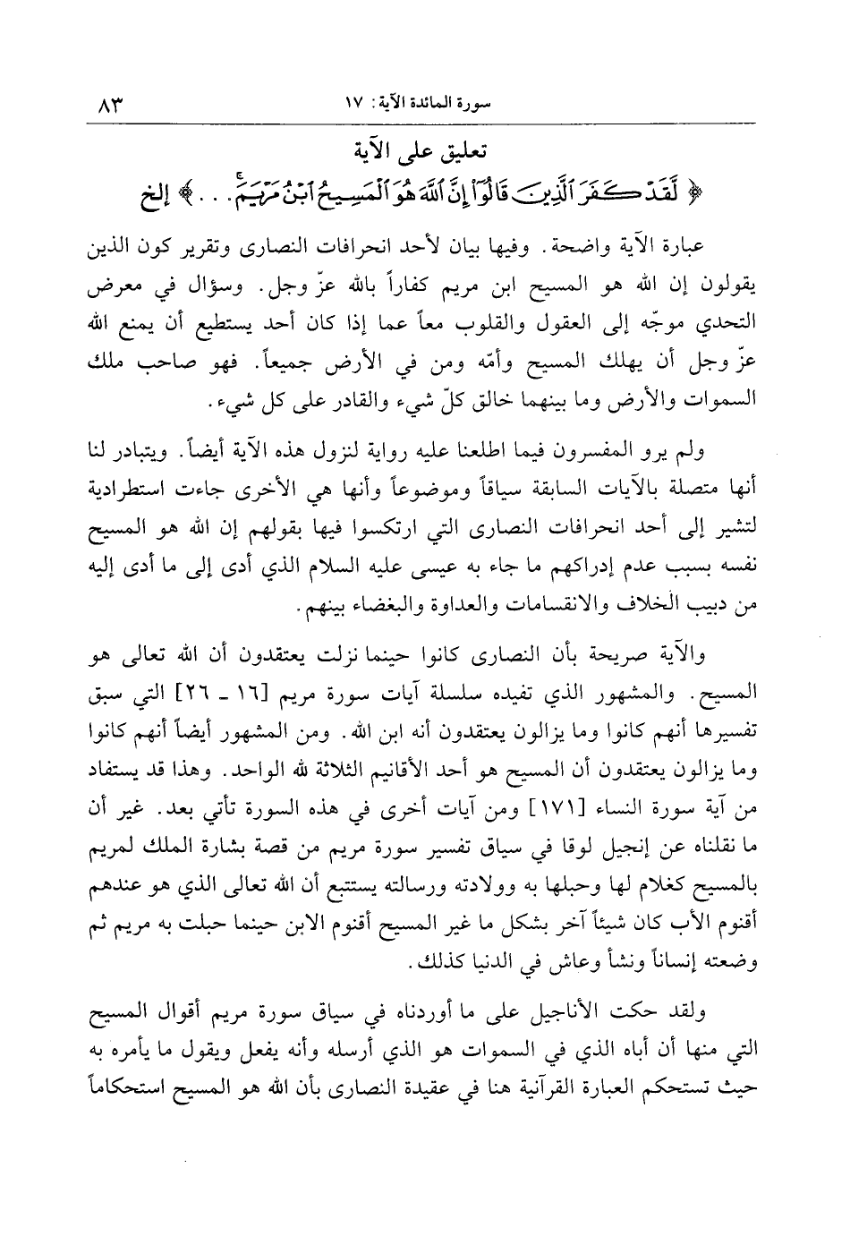 تعليق على الآية لَقَدْ كَفَرَ الَّذِينَ قالُوا إِنَّ اللَّهَ هُوَ الْمَسِيحُ ابْنُ مَرْيَمَ ... إلخ