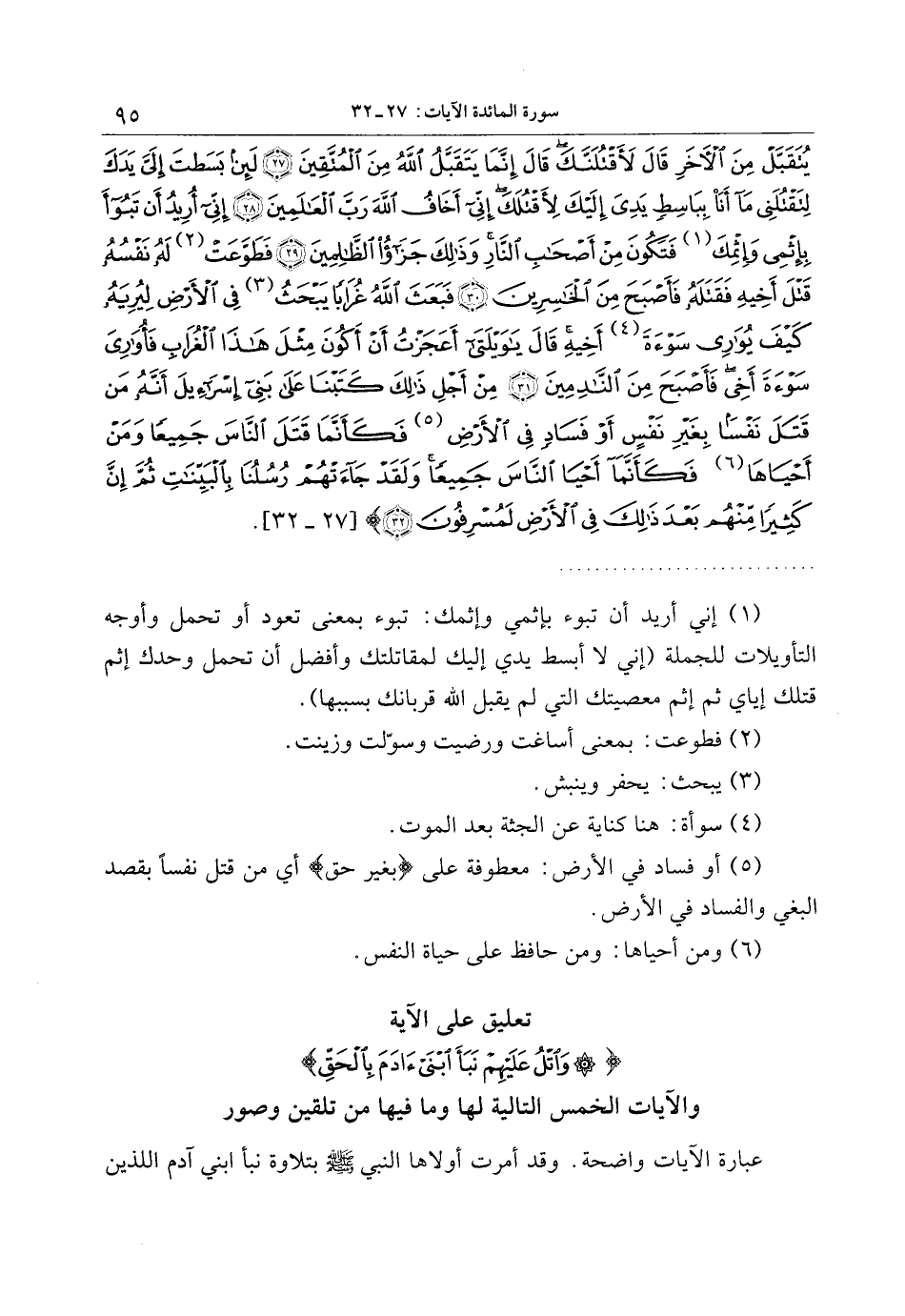 (1) إني أريد أن تبوء بإثمي وإثمك: تبوء بمعنى تعود أو تحمل وأوجه التأويلات للجملة (إني لا أبسط يدي إليك لمقاتلتك وأفضل أن تحمل وحدك إثم قتلك إياي ثم إثم معصيتك التي لم يقبل الله قربانك بسببها) .