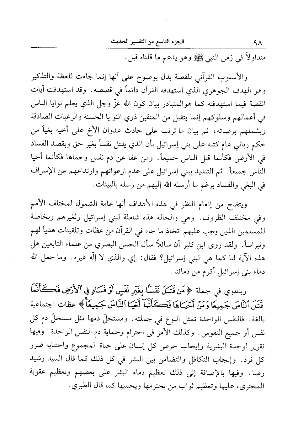 ويتضح من إنعام النظر في هذه الأهداف أنها عامة الشمول لمختلف الأمم وفي مختلف الظروف. وهي والحالة هذه شاملة لبني إسرائيل ولغيرهم وبخاصة للمسلمين الذين يجب عليهم اتخاذ ما جاء في القرآن من عظات وتلقينات هديا لهم ونبراسا. ولقد روى ابن كثير أن سائلا سأل الحسن البصري من علماء التابعين هل هذه الآية لنا كما هي لبني إسرائيل؟ فقال: إي والذي لا إله غيره. وما جعل الله دماء بني إسرائيل أكرم من دمائنا.