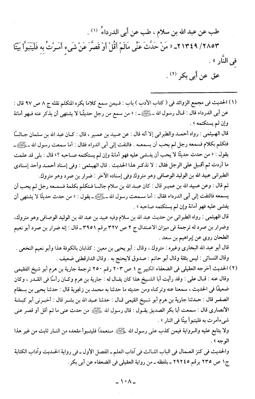 2853/ 21349 - "مَنْ حَدَّثَ عنِّي مَا لمْ أَقُلْ أَوْ قَصَّرَ عَنْ شَيءٍ أَمَرْتُ بِهِ فَليَتَبَوَّأ بَيتًا فِي النَّار".