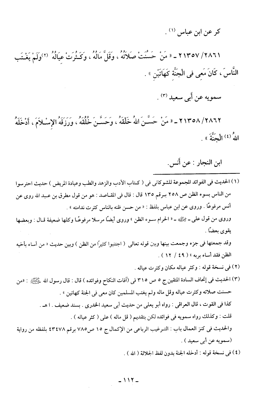 2862/ 21358 - "مَنْ حَسَّنَ اللهُ خَلقَهُ، وَحَسَّنَ خُلُقَهُ، وَرَزَقَهُ الإِسْلامَ، أَدْخَلَهُ الله (¬4) الجَنَّةَ".