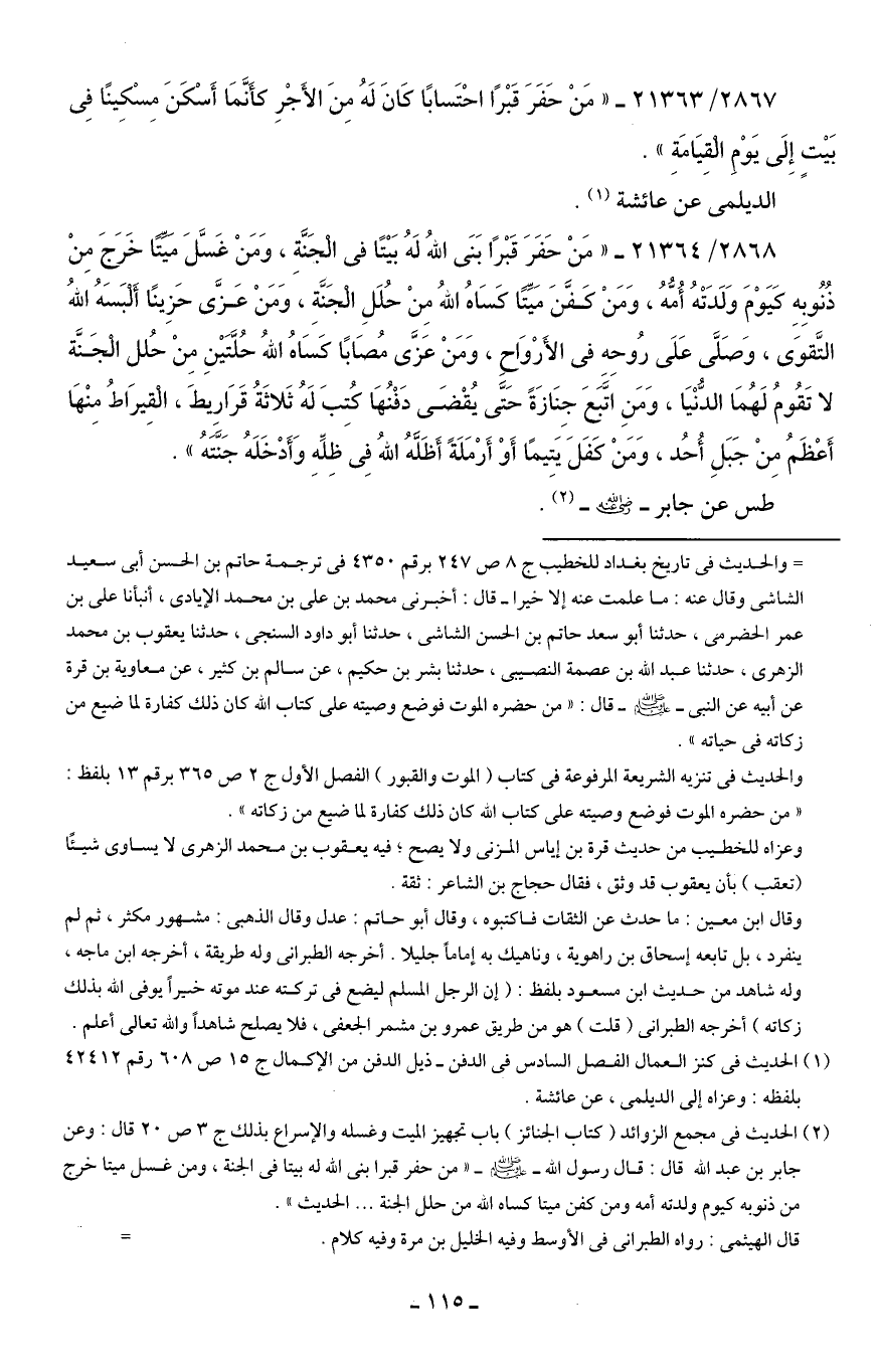 2867/ 21363 - "مَنْ حَفَرَ قَبْرًا احْتَسابًا كانَ لَهُ مِنَ الأَجْرِ كأَنَّمَا أَسْكَنَ مِسْكِينًا فِي بَيتٍ إِلَى يَوْمِ الْقِيَامَةِ".
