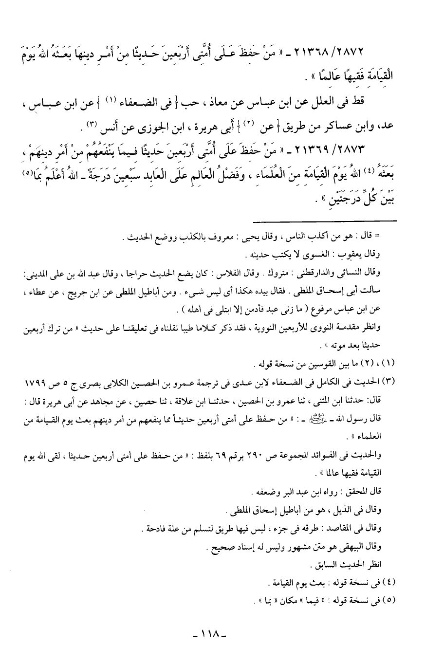 2872/ 21368 - "مَنْ حَفِظَ عَلَى أُمَّتي أَرْبَعِينَ حَدِيثًا مِنْ أَمْرِ دينِهَا بَعَثَهُ اللهُ يَوْمَ الْقِيَامَةِ فَقِيهًا عَالِمًا".