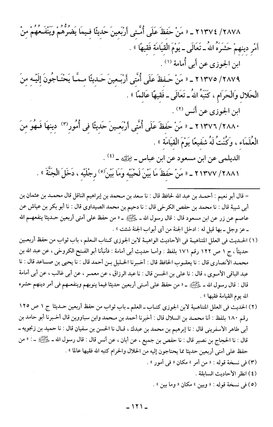 2880/ 21376 - "مَنْ حَفِظَ عَلَى أُمَّتِي أَرْبَعِينَ حَدِيثًا فِي أُمُورِ (¬3) دِينِهَا فَهُوَ مِنَ الْعُلَمَاءِ، وَكُنْتُ لَهُ شَفِيعًا يَوْمَ الْقِيَامَةِ".