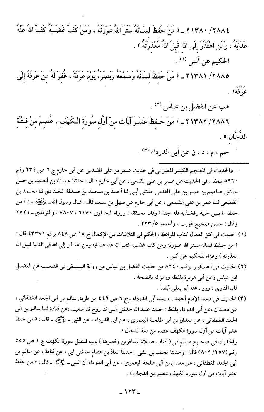 2885/ 21381 - "مَنْ حَفِظَ لِسَانَهُ وَسَمْعَهُ وَبَصَرَهُ يَوْمَ عَرَفَةَ، غُفِرَ لَهُ مِنْ عَرفَةَ إِلَى عَرَفَةَ".