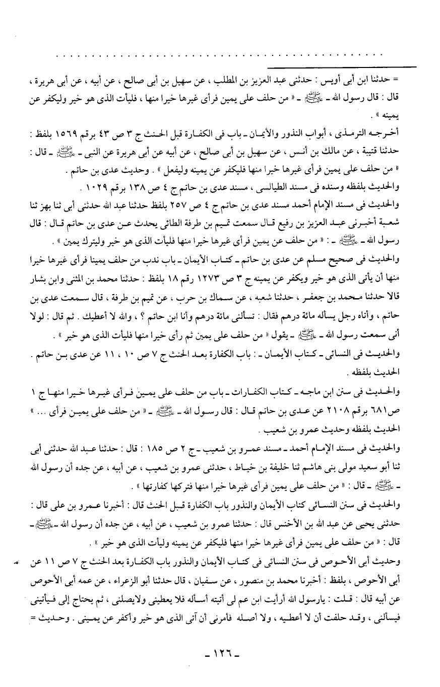وحديث أبي الأحوص في سنن النسائي في كتاب الأيمان والنذور باب الكفارة بعد الحنث ج 7 ص 11 عن أبي الأحوص، بلفظ: أخبرنا محمد بن منصور، عن سفيان، قال حدثنا أبو الزعراء، عن عمه أبي الأحوص عن أبيه قال: قلت: يا رسول الله أرأيت ابن عم لي أتيته أسأله فلا يعطينى ولا يصلنى، ثم يحتاج إلى فيأتينى فيسألنى، وقد حلفت أن لا أعطيه، ولا أصله فأمرنى أن آتى الذي هو خير وأكفر عن يمينى. وحديث =