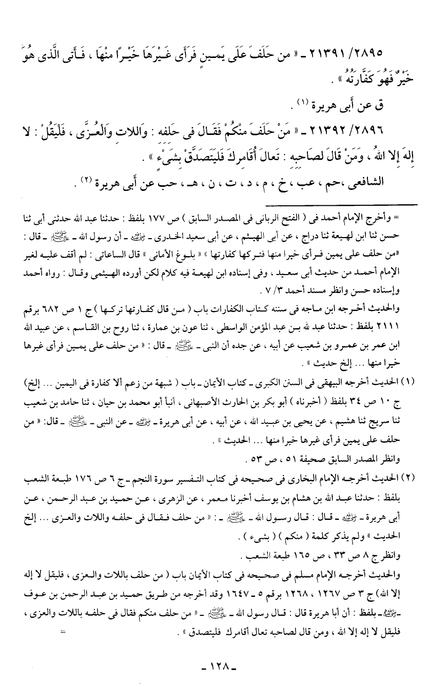 2895/ 21391 - "من حَلَفَ عَلَى يَمينٍ فَرَأَى غَيرَهَا خَيرًا منْهَا، فَأَتى الَّذي هُوَ خَير فَهُوَ كَفَّارَتُهُ".
