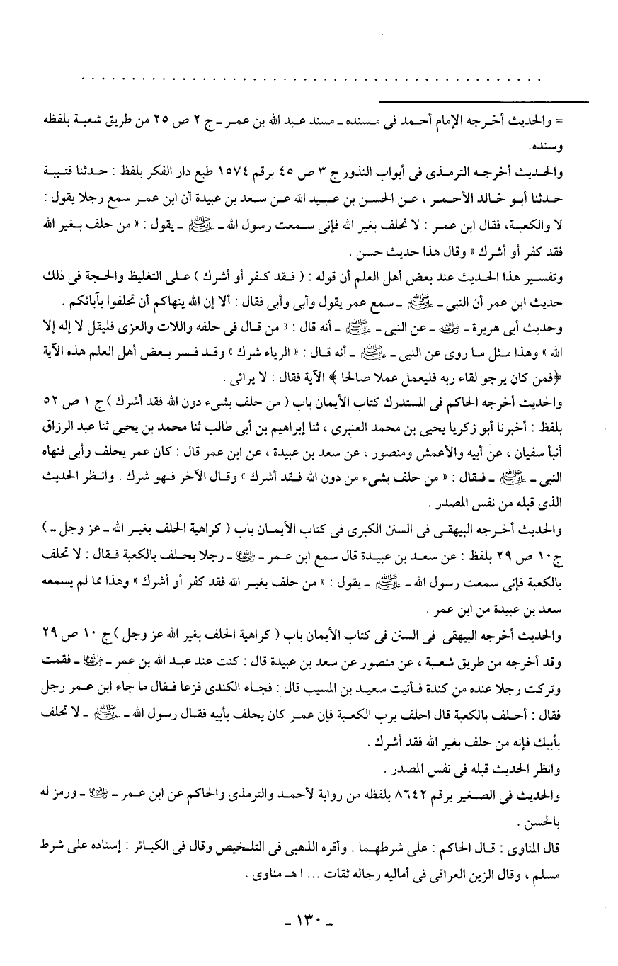 والحديث أخرجه الحاكم في المستدرك كتاب الأيمان باب (من حلف بشيء دون الله فقد أشرك) ج 1 ص 52 بلفظ: أخبرنا أبو زكريا يحيى بن محمد العنبرى، ثنا إبراهيم بن أبي طالب ثنا محمد بن يحيى ثنا عبد الرزاق أنبأ سفيان، عن أبيه والأعمش ومنصور، عن سعد بن عبيدة، عن ابن عمر قال: كان عمر يحلف وأبي فنهاه النبي - صلى الله عليه وسلم - فقال: "من حلف بشيء من دون الله فقد أشرك" وقال الآخر فهو شرك. وانظر الحديث الذي قبله من نفس المصدر.