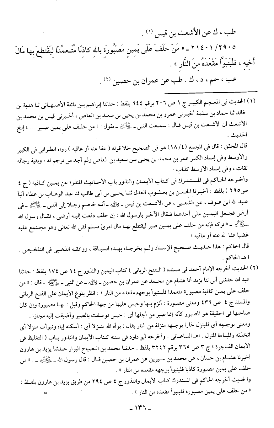 2905/ 21401 - "مَنْ حَلَفَ عَلَى يَمِينٍ مَصْبُورَةٍ باللهِ كاذِبًا مُتَعمِّدًا لِيَقْتطِعَ بِها مَال أَخِيهِ، فليَتبَوَّأ مَقْعَدَهُ مِنَ النَّارِ".
