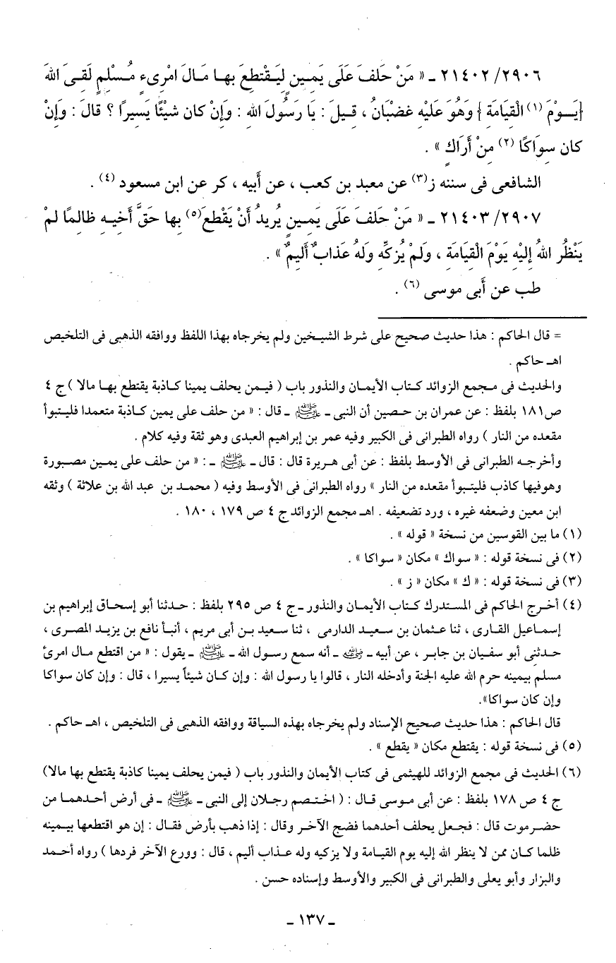 2907/ 21403 - "مَنْ حَلفَ عَلَى يَمينِ يُريدُ أَنْ يَقْطعَ (¬5) بِها حَقَّ أَخِيهِ ظالِمًا لمْ يَنْظُر اللهُ إِليهِ يَوْمَ الْقِيَامَةِ، وَلمْ يُزكِّه وَلهُ عَذابٌ أَليِمٌ".