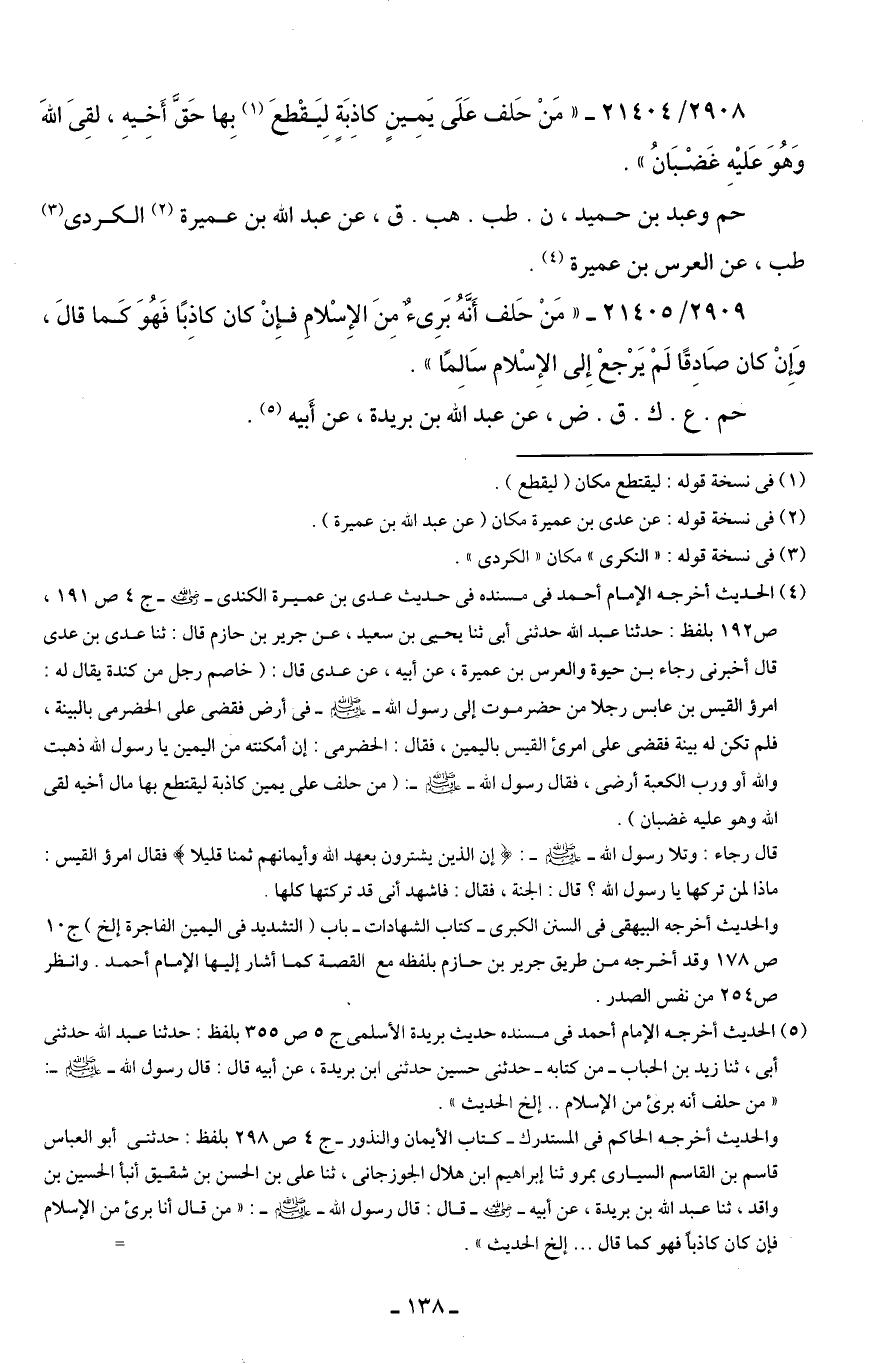 (¬5) الحديث أخرجه الإمام أحمد في مسنده حديث بريدة الأسلمي ج 5 ص 355 بلفظ: حدثنا عبد الله حدثني أبي، ثنا زيد بن الحباب -من كتابه- حدثني حسين حدثني ابن بريدة، عن أبيه قال: قال رسول الله - صلى الله عليه وسلم -: "من حلف أنه برئ من الإسلام .. إلخ الحديث".
