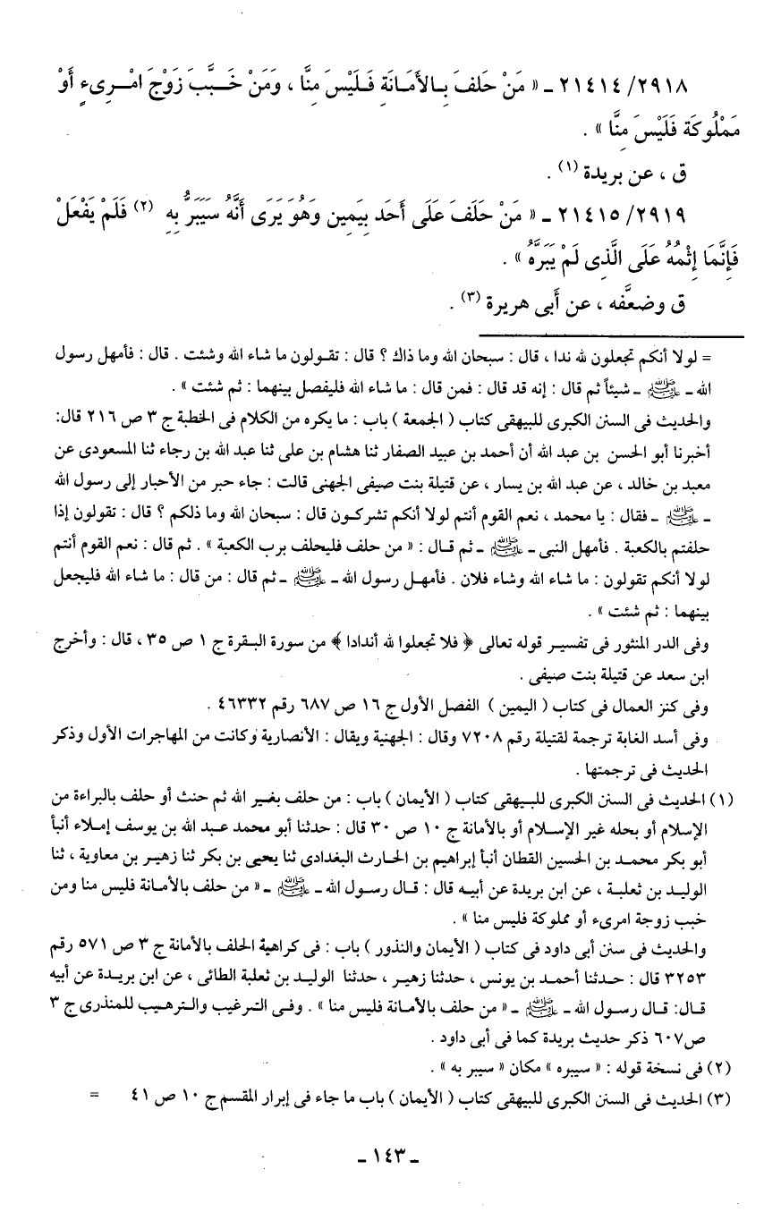 2918/ 21414 - "مَنْ حَلفَ بِالأمَانَةِ فَلَيسَ مِنَّا، وَمَنْ خَبَّبَ زَوْجَ امْرِئٍ أَوْ مَمْلُوكَة فَلَيسَ مِنَّا".