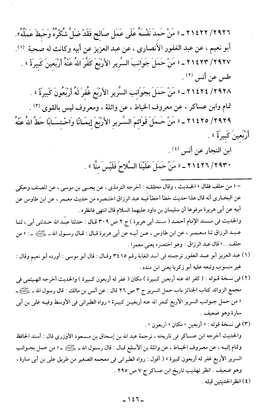 2927/ 21423 - "مَنْ حَمَلَ جَوَانِبَ السَّرِير الأَرْبَعَ كفَّرَ اللهُ عَنْهُ أَرْبَعِينَ كَبِيرَةً".