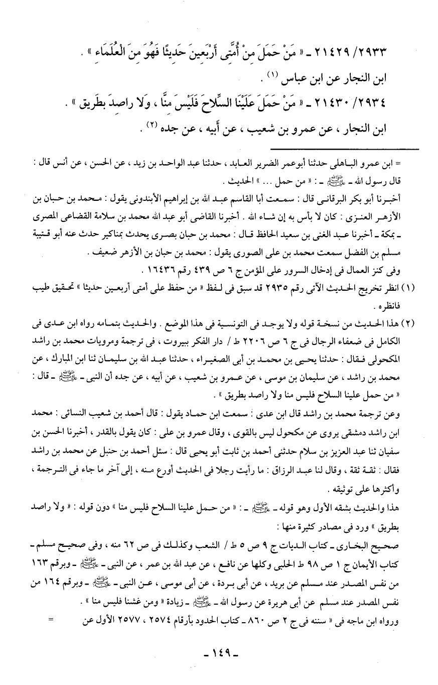 2934/ 21430 - "مَنْ حَمَلَ عَلَينَا السِّلاحَ فَلَيسَ مِنَّا، وَلا راصِدَ بطَريق".