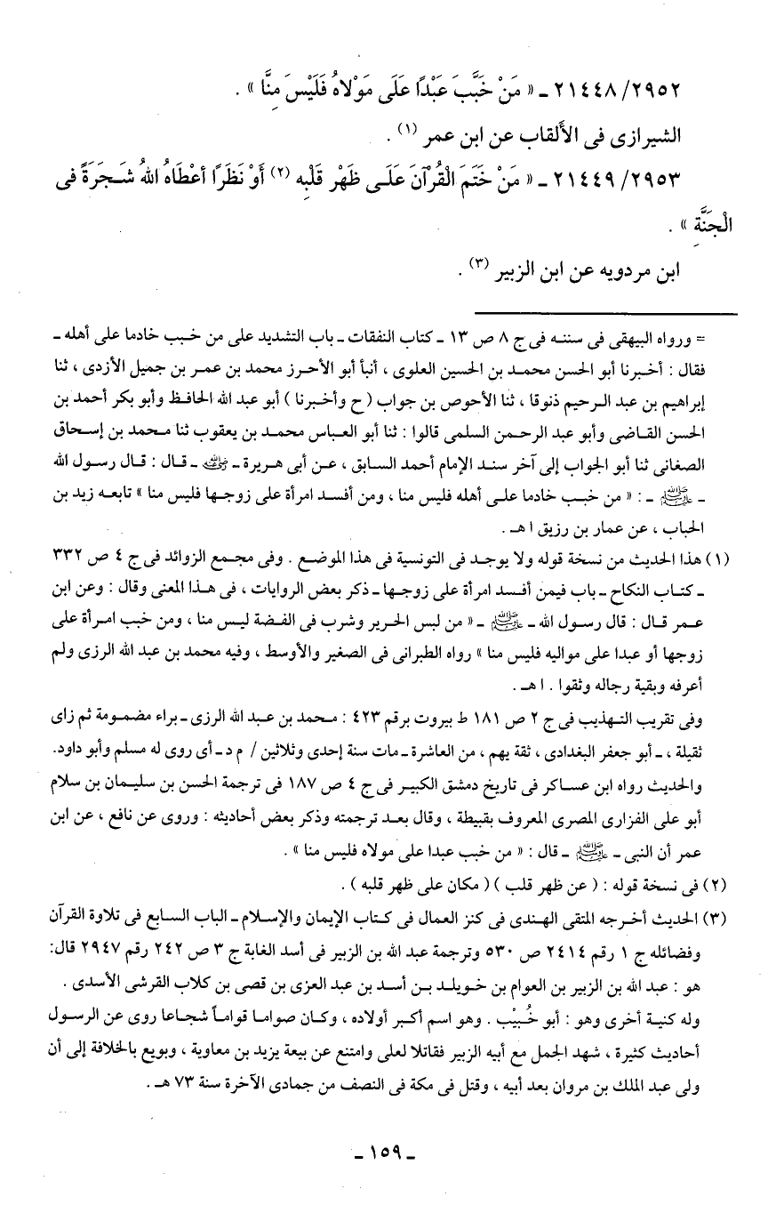 (¬3) الحديث أخرجه المتقى الهندي في كنز العمال في كتاب الإيمان والإسلام- الباب السابع في تلاوة القرآن وفضائله ج 1 رقم 2414 ص 530 وترجمة عبد الله بن الزبير في أسد الغابة ج 3 ص 242 رقم 2947 قال هو: عبد الله بن الزبير بن العوام بن خويلد بن أسد بن عبد العزى بن قصى بن كلاب القرشي الأسدي. وله كنية أخرى وهو: أبو خُبيب. وهو اسم أكبر أولاده، وكان صواما قوامًا شجاعا روى عن الرسول أحاديث كثيرة، شهد الجمل مع أبيه الزبير فقاتلا لعلى وامتنع عن بيعة يزيد بن معاوية، وبويع بالخلافة إلى أن ولى عبد الملك بن مروان بعد أبيه، وقتل في مكة في النصف من جمادى الآخرة سنة 73 هـ.