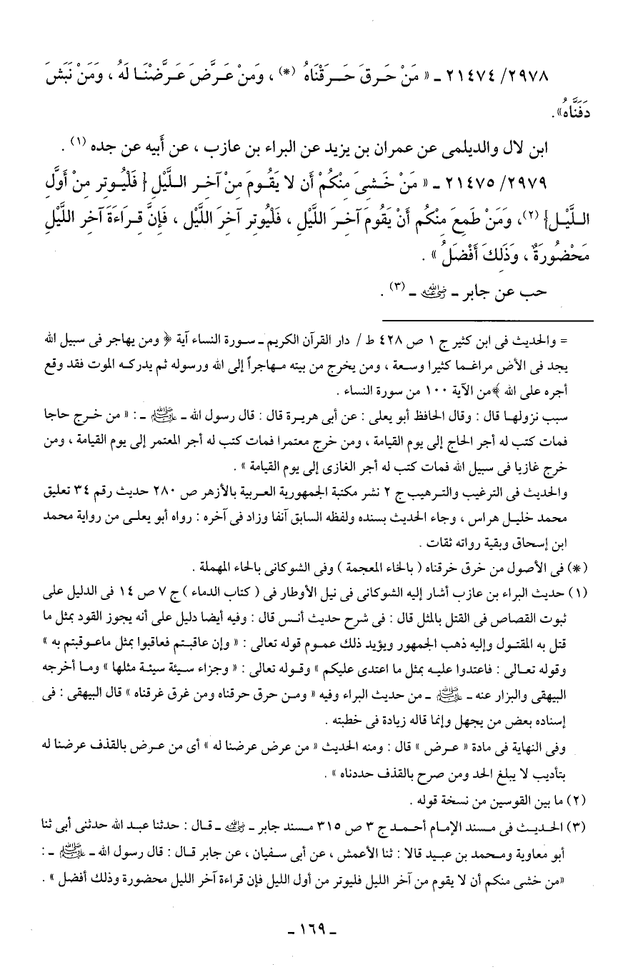 (¬3) الحديث في مسند الإمام أحمد ج 3 ص 315 مسند جابر - رضي الله عنه - قال: حدثنا عبد الله حدثني أبي ثنا أبو معاوية ومحمد بن عبيد قالا: ثنا الأعمش، عن أبي سفيان، عن جابر قال: قال رسول الله - صلى الله عليه وسلم -: "من خشى منكم أن لا يقوم من آخر الليل فليوتر من أول الليل فإن قراءة آخر الليل محضورة وذلك أفضل".