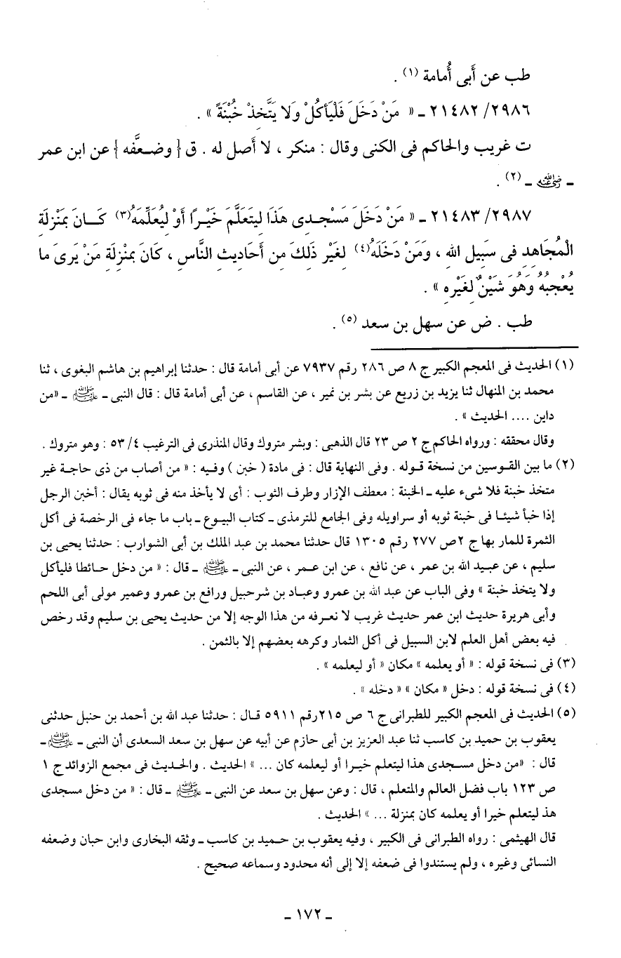 (¬5) الحديث في المعجم الكبير للطبراني ج 6 ص 215 رقم 5911 قال: حدثنا عبد الله بن أحمد بن حنبل حدثني يعقوبابن حميد بن كاسب ثنا عبد العزيز بن أبي حازم عن أبيه عن سهل بن سعد السعدى أن النبي - صلى الله عليه وسلم - قال: "من دخل مسجدى هذا ليتعلم خيرا أو ليعلمه كان. . ." الحديث. والحديث في مجمع الزوائد ج 1 ص 123 باب فضل العالم والمتعلم، قال: وعن سهل بن سعد عن النبي - صلى الله عليه وسلم - قال: "من دخل مسجدى هذ ليتعلم خيرا أو يعلمه كان بمنزلة. . ." الحديث.
