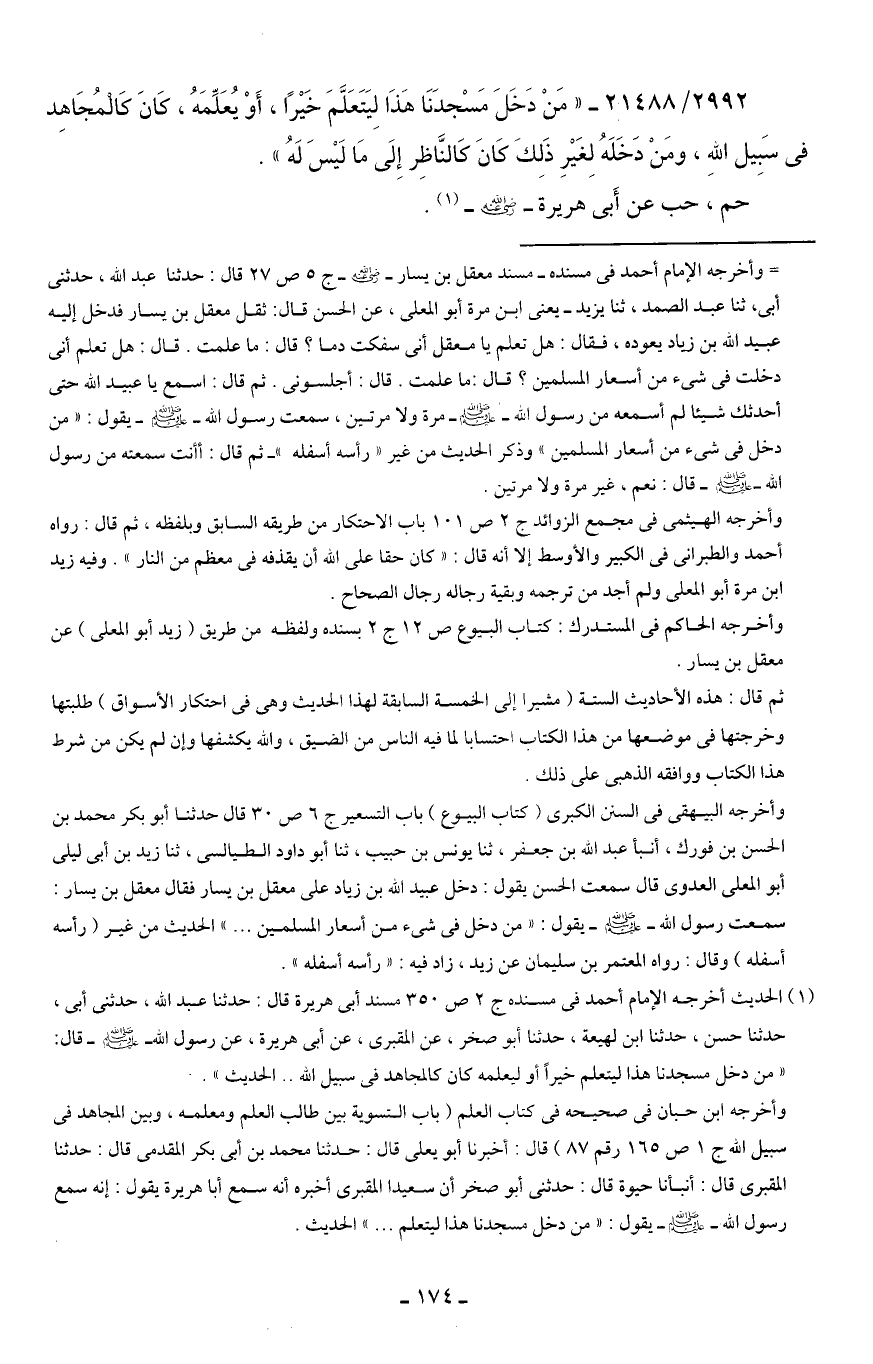 2992/ 21488 - "مَنْ دَخَلَ مَسْجدَنَا هَذَا لِيَتَعَلَّمَ خَيرًا، أَوْ يُعَلِّمَهُ، كَانَ كَالمُجَاهِد في سَبِيل اللهِ، ومَن دَخَلَهُ لِغَيرِ ذَلِكَ كَانَ كَالنَّاظِر إِلَى مَا لَيسَ لَهُ".