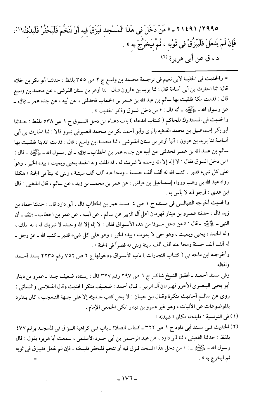 2995/ 21491 - "مَنْ دَخَلَ في هَذَا الْمَسْجدِ فَبَزَقَ فِيهِ أَوْ تَنَخَّمَ فَليَحْفُرْ فَليدْفِنْه (¬1)، فَإِنْ لَمْ يَفعَلْ فَليَبْزُقْ في ثَوْبهِ، ثُمَّ لِيَخْرُجْ بهِ".