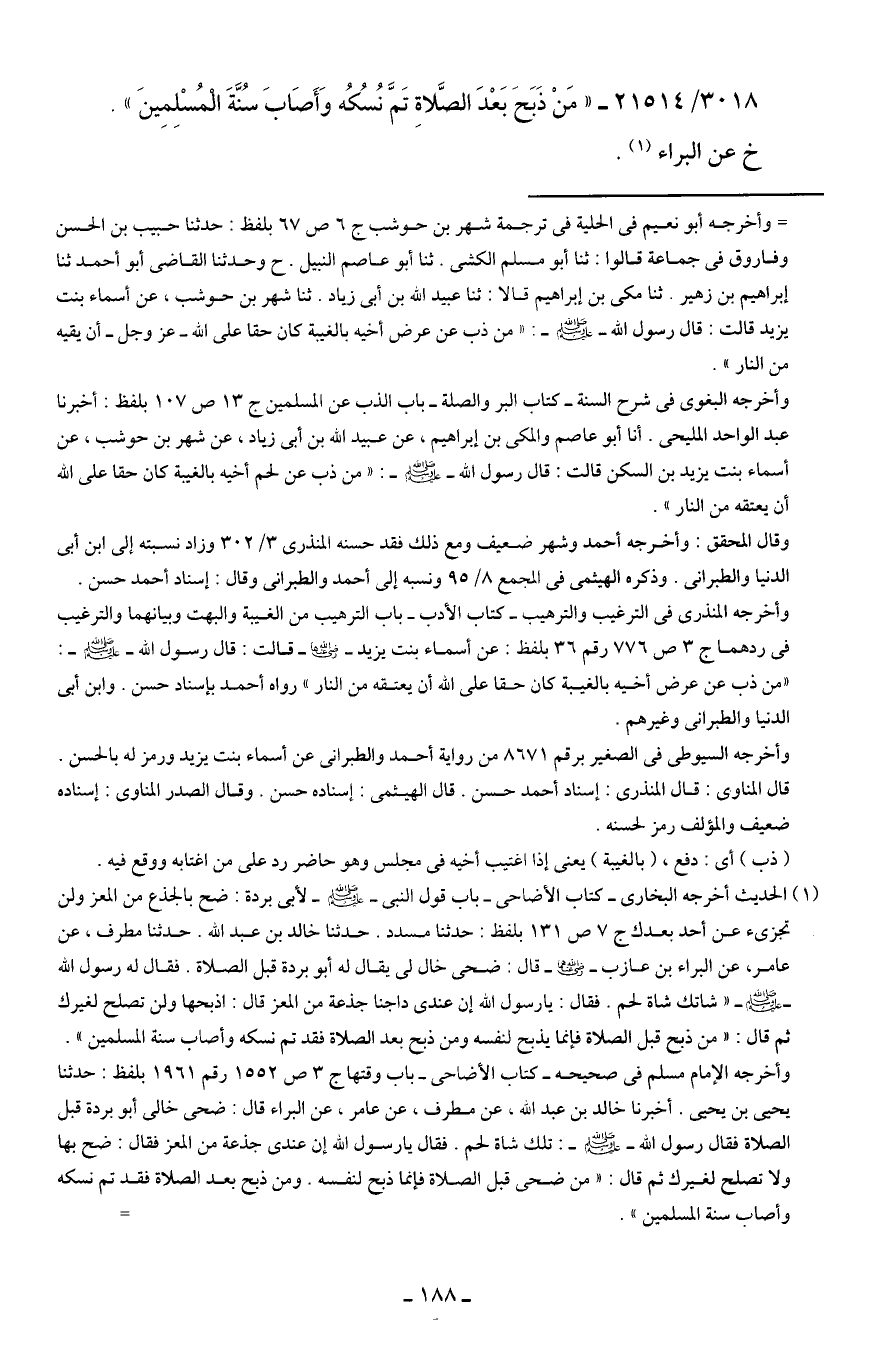 3018/ 21514 - "مَنْ ذَبَحَ بَعْدَ الصَّلاةِ تَمَّ نُسُكُه وَأَصَابَ سُنَّةَ الْمُسْلِمِينَ".