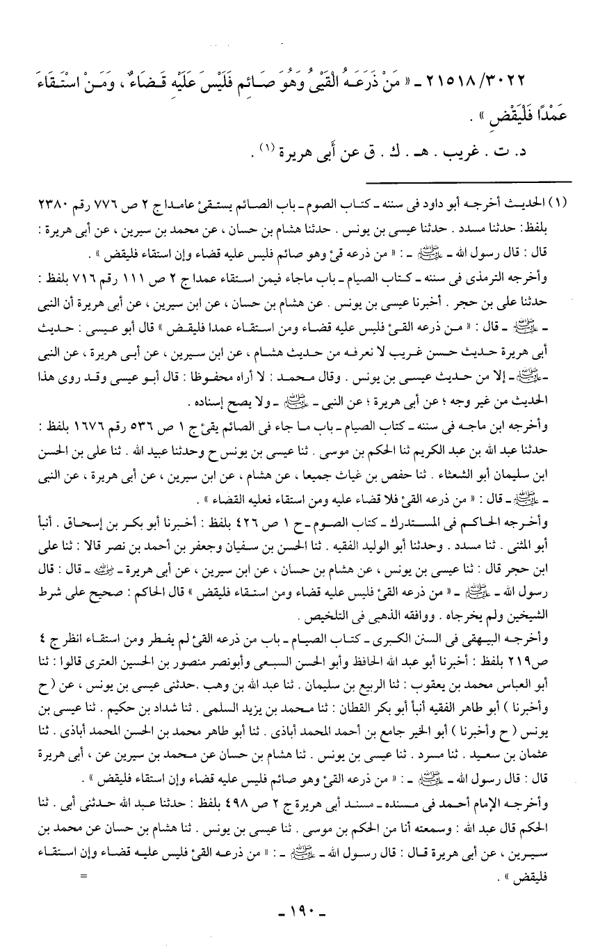 3022/ 21518 - "مَنْ ذَرَعَهُ القَيْيُ وَهُوَ صَائِم فَلَيسَ عَلَيهِ قَضَاءٌ، وَمَنْ اسْتَقَاءَ عَمْدًا فَليَقْضِ".