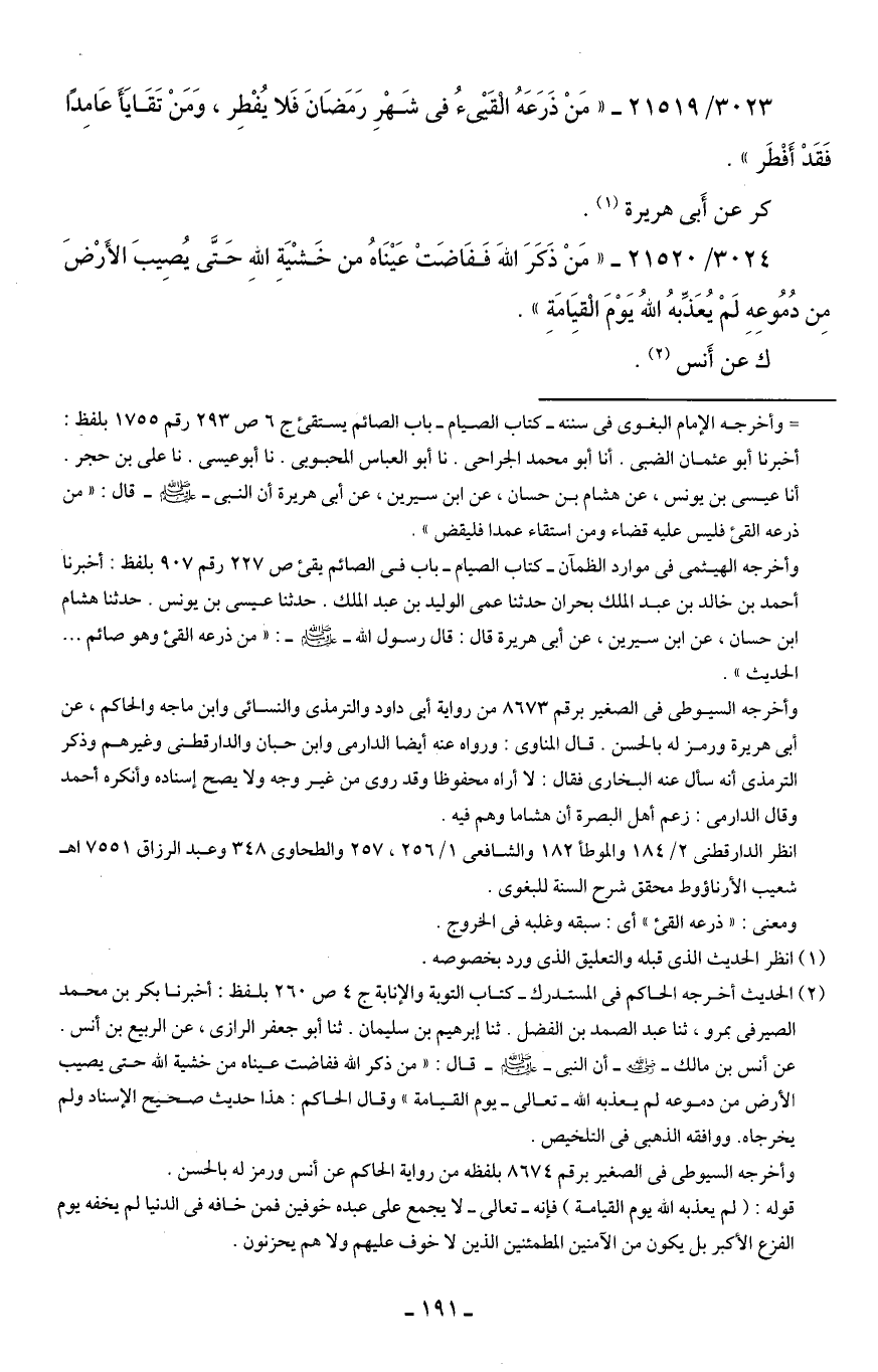 3023/ 21519 - "مَنْ ذَرَعَهُ الْقَىْءُ في شَهْرِ رَمَضَانَ فَلا يُفْطِر، وَمَنْ تَقَايَأَ عَامِدًا فَقَدْ أَفْطَر".