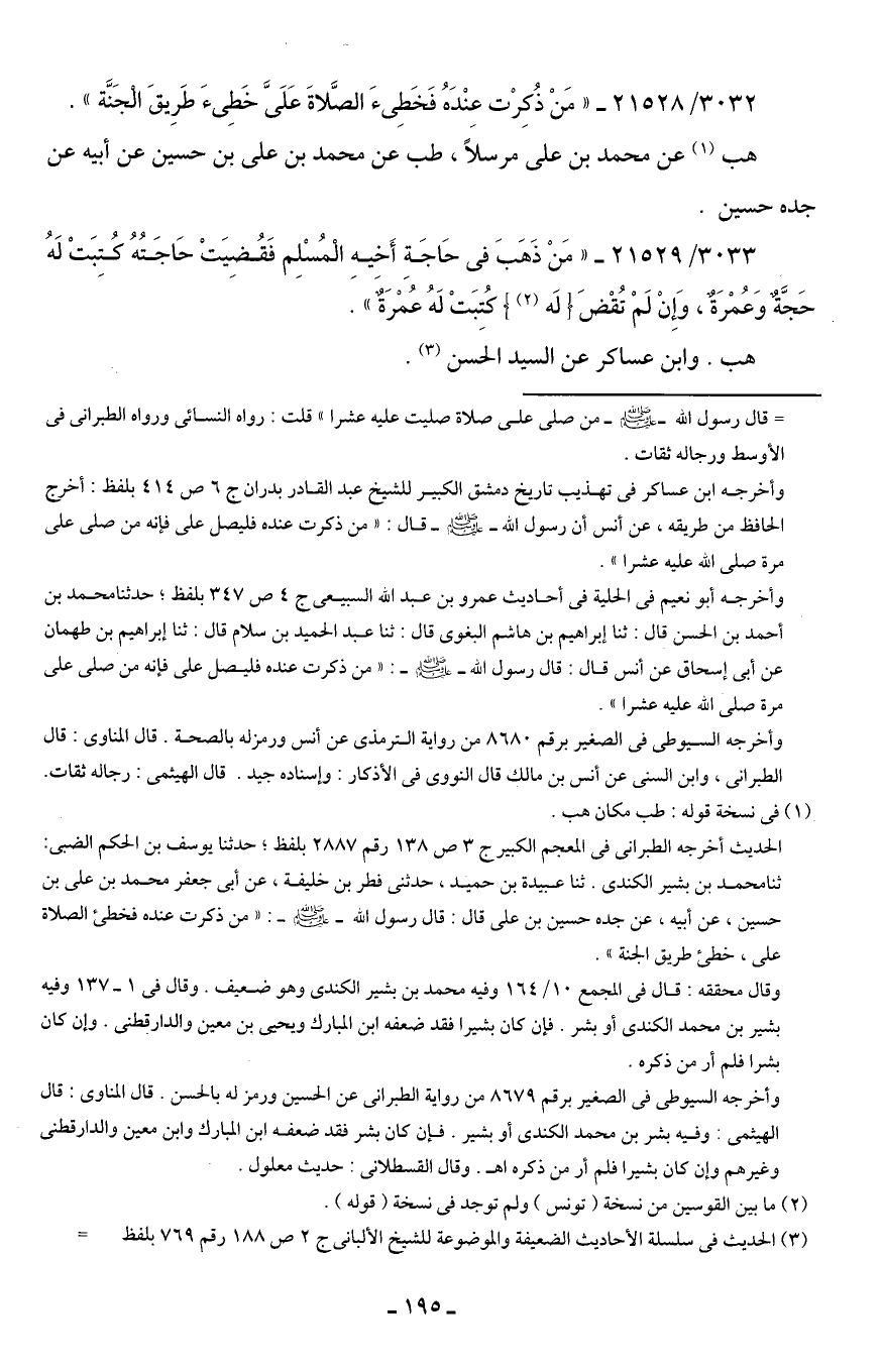 3033/ 21529 - "مَنْ ذَهَبَ في حَاجَةِ أَخيهِ الْمُسْلِم فَقُضِيَتْ حَاجَتُهُ كتِبَتْ لَهُ حَجَّةٌ وَعُمْرَةٌ، وَإِنْ لَمْ تُقْضَ {لَه (¬2)} كُتِبَتْ لَهُ عُمْرَةٌ".