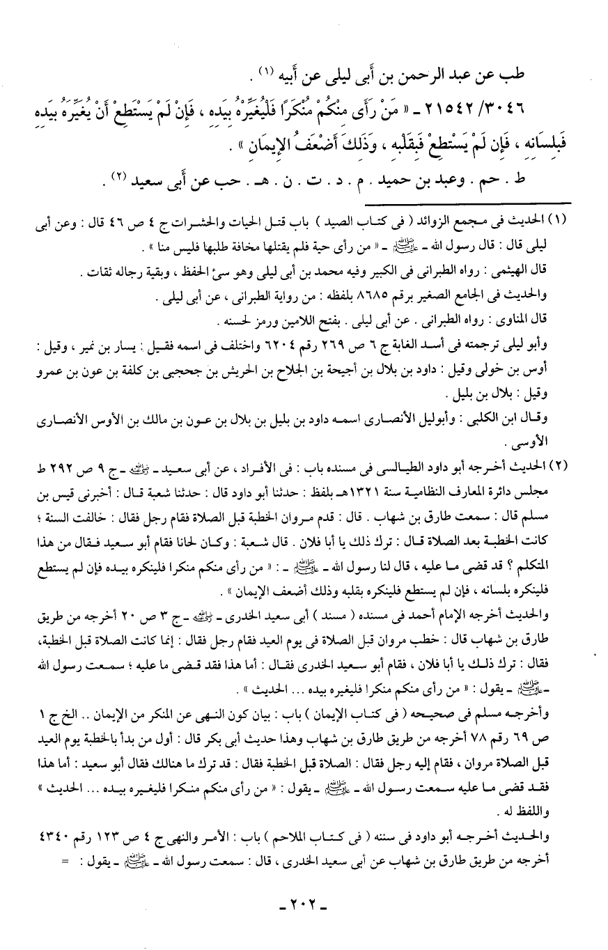 (¬2) الحديث أخرجه أبو داود الطيالسي في مسنده باب: في الأفراد، عن أبي سعيد - رضي الله عنه - ج 9 ص 292 ط مجلس دائرة المعارف النظامية سنة 1321 هـ بلفظ: حدثنا أبو داود قال: حدثنا شعبة قال: أخبرني قيس بن مسلم قال: سمعت طارق بن شهاب. قال: قدم مروان الخطبة قبل الصلاة فقام رجل فقال: خالفت السنة؛ كانت الخطبة بعد الصلاة قال: ترك ذلك يا أبا فلان. قال شعبة: وكان لحانا فقام أبو سعيد فقال من هذا المتكلم؟ قد قضى ما عليه، قال لنا رسول الله - صلى الله عليه وسلم -: "من رأى منكم منكرا فلينكره بيده فإن لم يستطع فلينكره بلسانه، فإن لم يستطع فلينكره بقلبه وذلك أضعف الإيمان".
