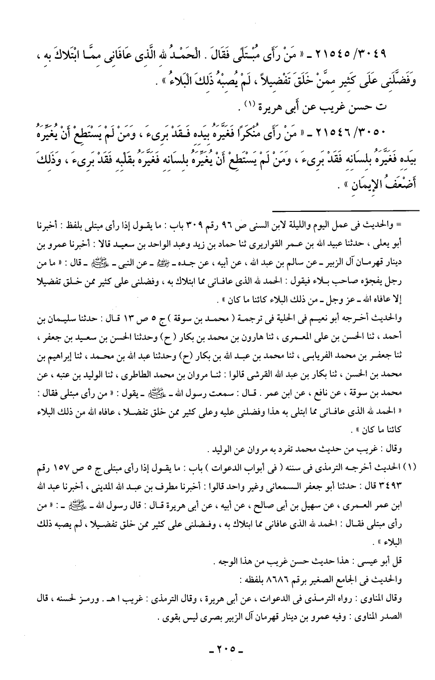 3049/ 21545 - "مَنْ رَأَى مُبْتَلى فَقَال: الحَمْدُ للهِ الَّذِي عَافَانِي مِمَّا ابْتَلاكَ بهِ، وَفَضَّلَنِي عَلَى كَثِير مِمَّنْ خَلَقَ تَفْضِيلًا، لَمْ يُصِبْهُ ذلِكَ البَلاءُ".