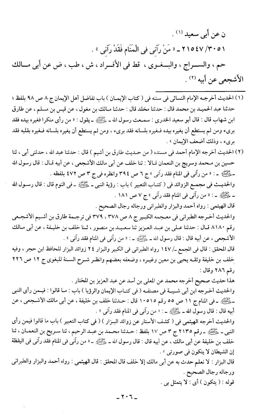 (¬2) الحديث أخرجه الإمام أحمد في مسنده (من حديث طارق بن أشيم) قال. حدثنا عبد الله، حدثني أبي، ثنا حسين بن محمد وسريج بن النعمان قالا: ثنا خلف عن أبي مالك الأشجعي، عن أبيه قال: قال رسول الله - صلى الله عليه وسلم -: "من رآني في المنام فقد رآني" ج 6 ص 394 وانظره في ج 3 ص 472 بلفظه.