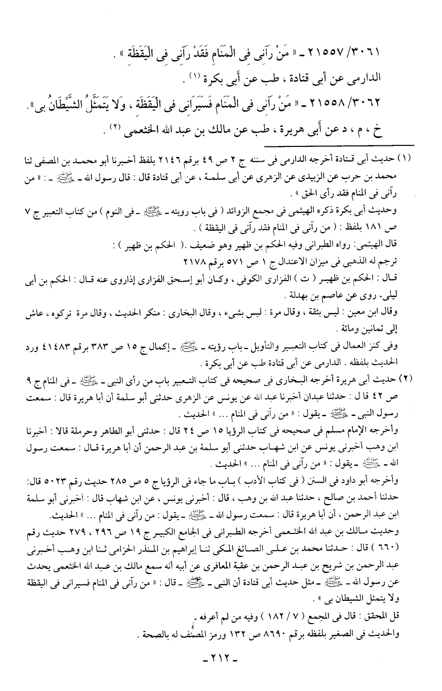 (¬1) حديث أبي قتادة أخرجه الدارمي في سننه ج 2 ص 49 برقم 2146 بلفظ أخبرنا أبو محمد بن المصفى ثنا محمد بن حرب عن الزيدي عن الزهري عن أبي سلمة، عن أبي قتادة قال: قال رسول الله - صلى الله عليه وسلم -: "من رآني في المنام فقد رأى الحق".