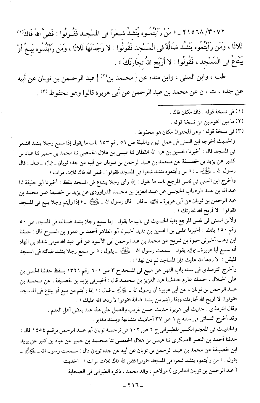 3072/ 21568 - "مَنْ رَأَيتُمُوه يُنْشِدُ شِعْرًا في المسْجد فَقُولُوا: فَضَّ اللهُ فَاكَ (¬1) ثَلاثًا، وَمَن رَأَيتُمُوه يَنْشُد ضَالَّةً في المَسْجِد فَقُولُوا: لا وَجَدْتَهَا ثَلاثًا، وَمَن رَأَيتُمُوه يَبِيعُ أَوْ يَبْتَاعُ في المَسْجِد، فَقُولُوا: لا أَرْبَح اللهُ تِجَارَتَكَ".