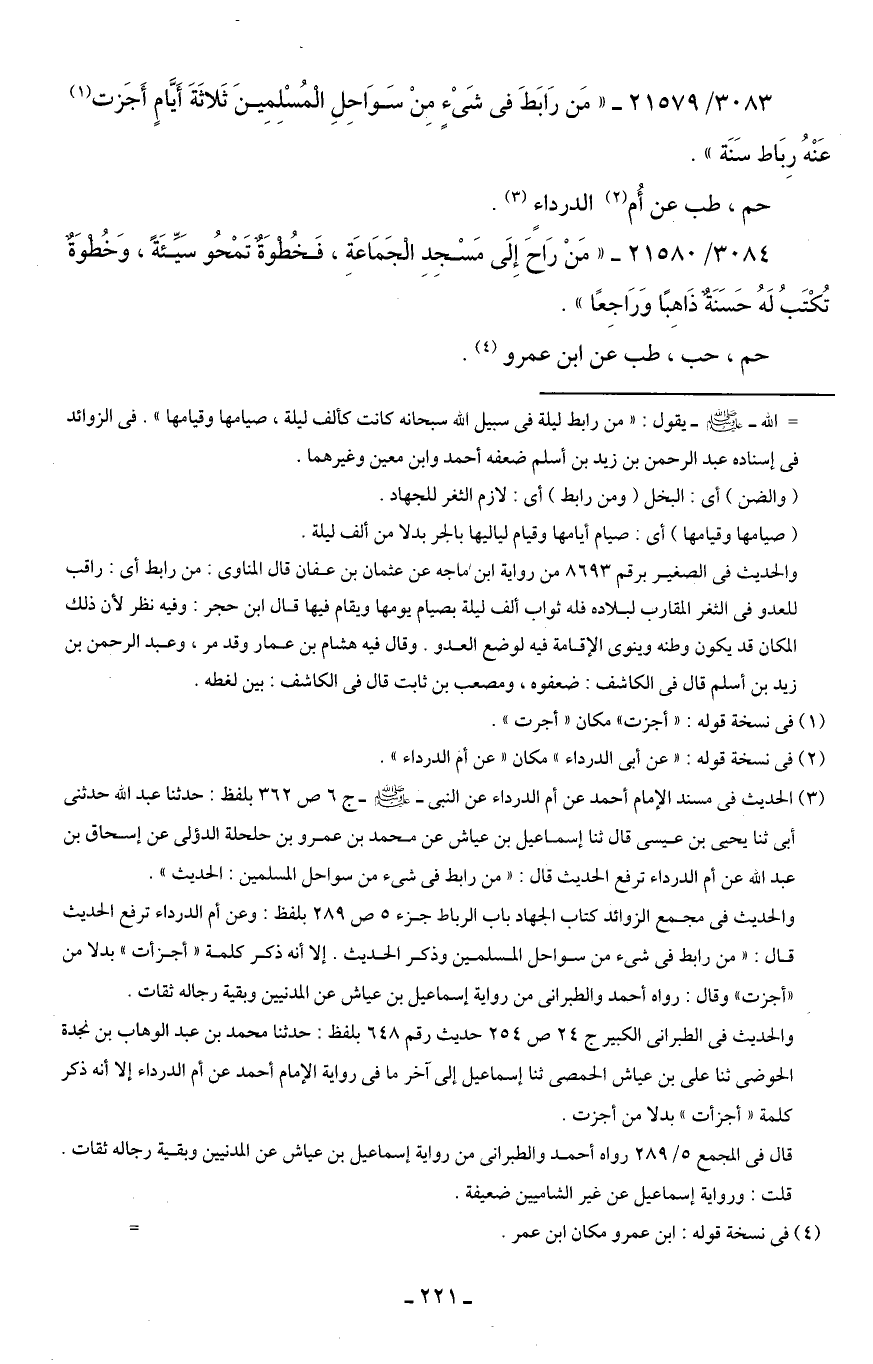 3083/ 21579 - "مَن رَابَطَ في شَيْءٍ مِنْ سَوَاحِلِ المُسْلِمِينَ ثَلاثَةَ أَيَّامٍ أَجَزت (¬1) عَنْهُ رِبَاط سَنَة".