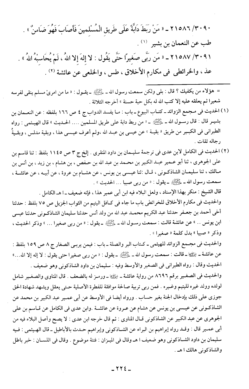 (¬2) الحديث في الكامل لابن عبدي في ترجمة سليمان بن داود المنقري. إلخ ج 3 ص 1145 بلفظ: ثنا قاسم بن على الجوهرى، ثنا أبو عمير عبد الكبير بن محمد بن عبد الله بن حفص، بن هشام، بن زيد، بن أنس بن مالك، ثنا سليمان الشاذكونى، قال: ثنا عيسى بن يونس، عن هشام بن عروة، عن أبيه، عن عائشة، سمعت رسول الله - صلى الله عليه وسلم - يقول: "من ربى صبيا ... الحديث".