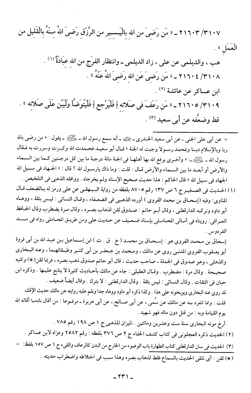 3107/ 21603 - "مَن رَضِيَ من اللهِ بِالْيَسِيِر من الرِّزْقِ رَضِيَ اللهُ مِنْهُ بِالْقَلِيل من الْعَمَلِ".