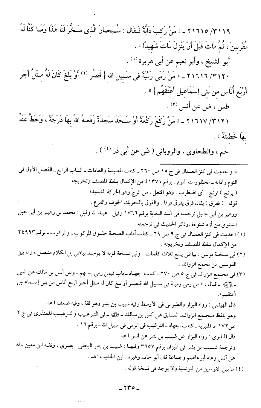 (¬3) في مجمع الزوائد في ج 5 ص 270 - كتاب الجهاد -باب فيمن رمى بسهم- وعن أنس بن مالك عن النبي - صلى الله عليه وسلم - قال: "من رمى رمية في سبيل الله قصر أو بلغ كان له مثل أجر أربع أناس من بنى إسماعيل أعتقهم".