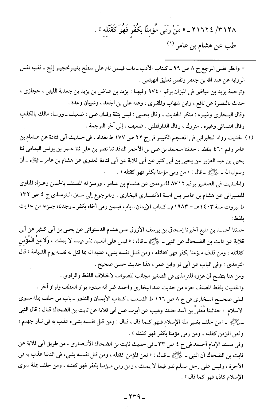 3128/ 21624 - "مَنْ رَمَى مُؤمِنًا بكُفْرٍ فَهُوَ كَقَتْلِهِ".