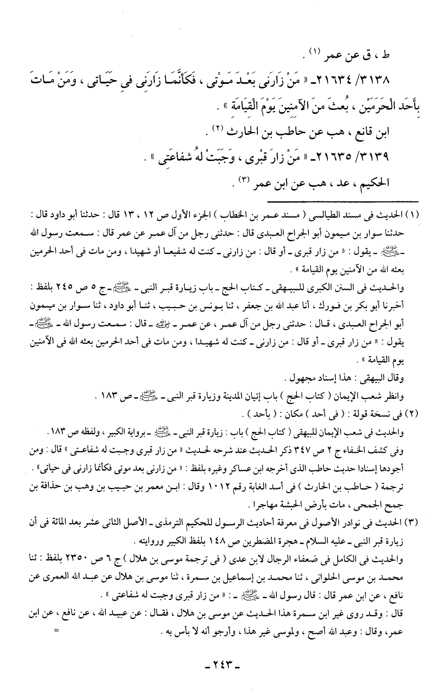 3138/ 21634 - "مَنْ زَارَنى بَعْدَ مَوْتى، فَكَأنَّمَا زَارَنِي في حَيَاتى، وَمَنْ مَاتَ بِأَحَد الْحَرَمَين، بُعثَ منَ الآمِنِينَ يَومَ الْقِيَامَةِ".