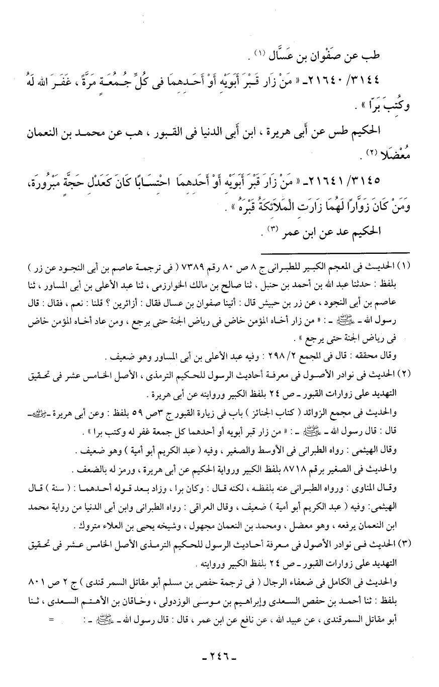 3144/ 21640 - "مَنْ زَار قَبْرَ أَبَوَيهِ أَوْ أَحَدِهِمَا في كُلِّ جُمُعَةِ مَرَّةً، غَفَرَ الله لَهُ وكُتِبَ بَرًّا".