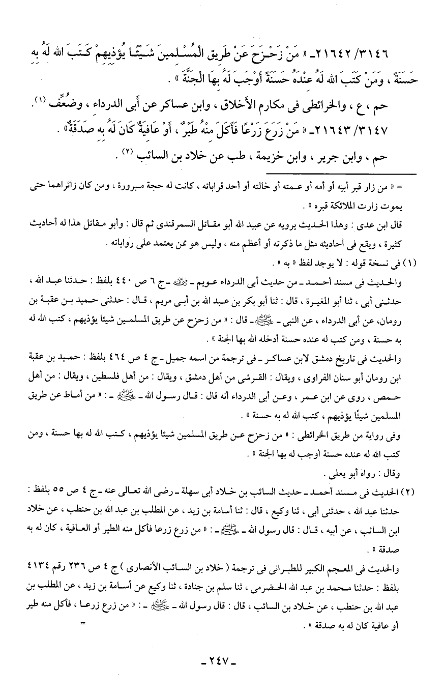 3146/ 21642 - "مَنْ زَحْزَحَ عَنْ طَرِيق الْمُسْلمينَ شَيئًا يُؤذيِهِمْ كَتَبَ الله لَهُ بِهِ حَسَنَةً، وَمَنْ كتَبَ الله لَهُ عِنْدَهُ حَسَنَةً أَوْجَبَ لَهُ بِهَا الْجَنَّةَ".