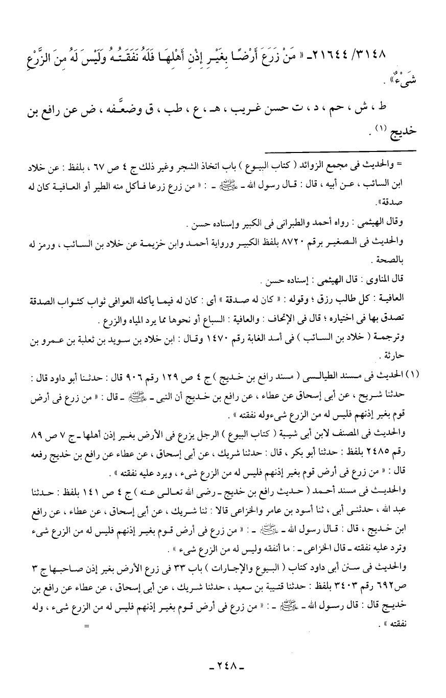 3148/ 21644 - "مَنْ زَرَعَ أَرْضًا بِغَيرِ إِذْنِ أَهْلِهَا فَلَهُ نَفَقَتُهُ وَلَيسَ لَهُ مِنَ الزَّرعِ شَيْءٌ".