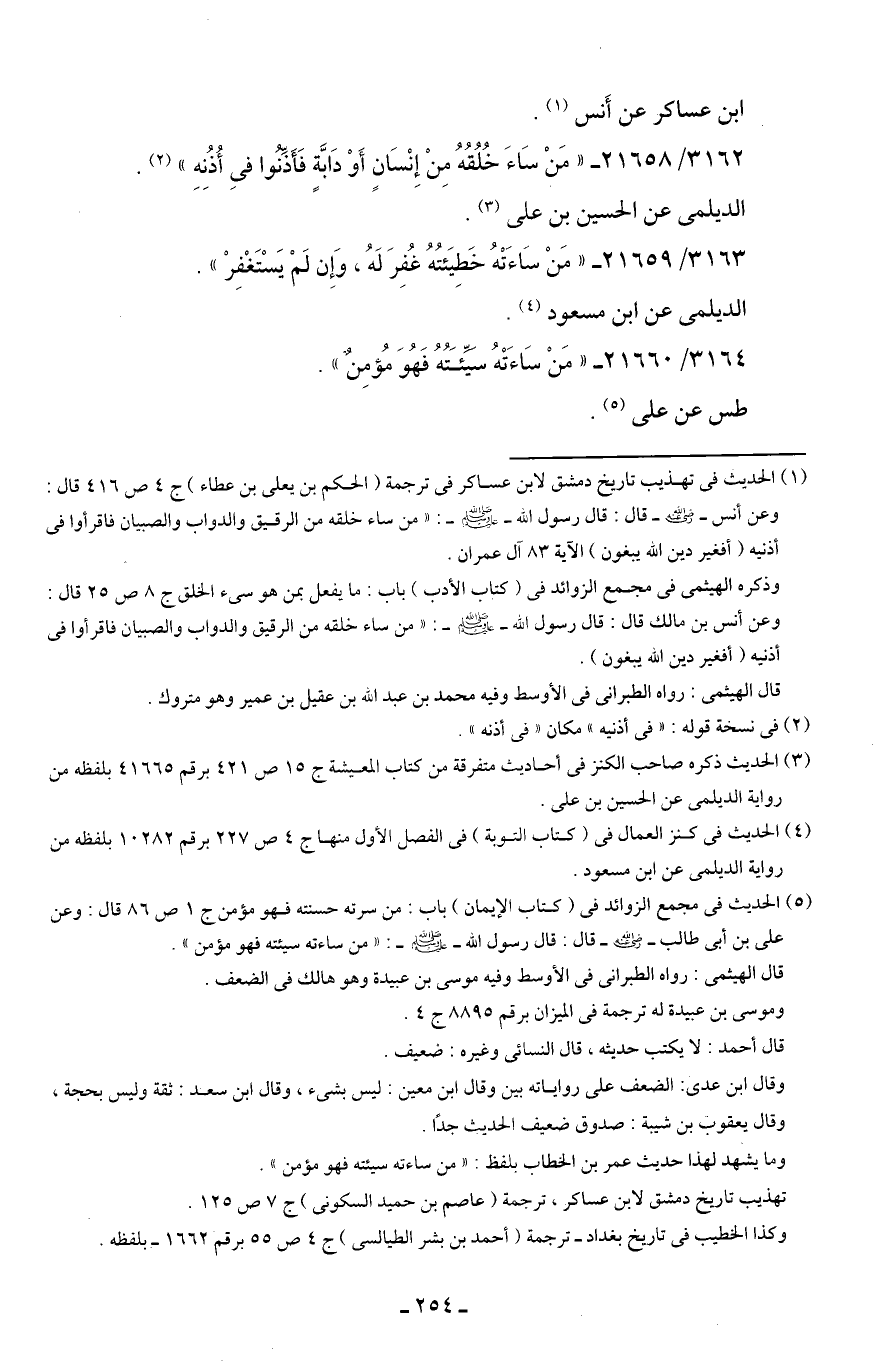 3164/ 21660 - "مَنْ سَاءَتْهُ سيِّئَتُهُ فَهُوَ مُؤمِنٌ".
