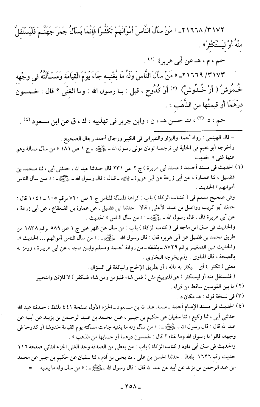 3172/ 21668 - "مَنْ سَأَلَ النَّاسَ أَمْوَالهُمْ تَكَثُّرًا فَإِنَّمَا يَسْألُ جَمْرَ جَهَنَّمَ فَلْيَسْتَقِلَّ مِنْهُ أَوْ لِيَسْتَكْثِرْ".