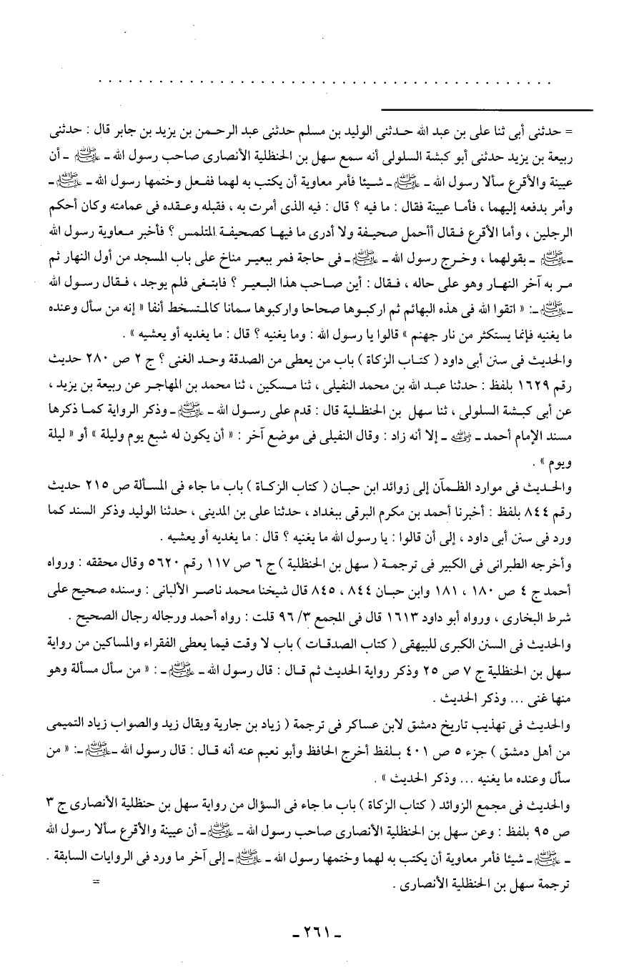 وأخرجه الطبراني في الكبير في ترجمة (سهل بن الحنظلية) ج 6 ص 117 رقم 5620 وقال محققه: ورواه أحمد ج 4 ص 180، 181 وابن حبان 844، 845 قال شيخنا محمد ناصر الألباني: وسنده صحيح على شرط البخاري، ورواه أبو داود 1613 قال في المجمع 3/ 96 قلت: رواه أحمد ورجاله رجال الصحيح. والحديث في الله الكبرى للبيهقي (كتاب الصدقات) باب لا وقت فيما يعطى الفقراء والمساكين من رواية سهل بن الحنظلية ج 7 ص 25 وذكر رواية الحديث ثم قال: قال رسول الله - صلى الله عليه وسلم -: "من سأل مسألة وهو منها غنى ... وذكر الحديث.