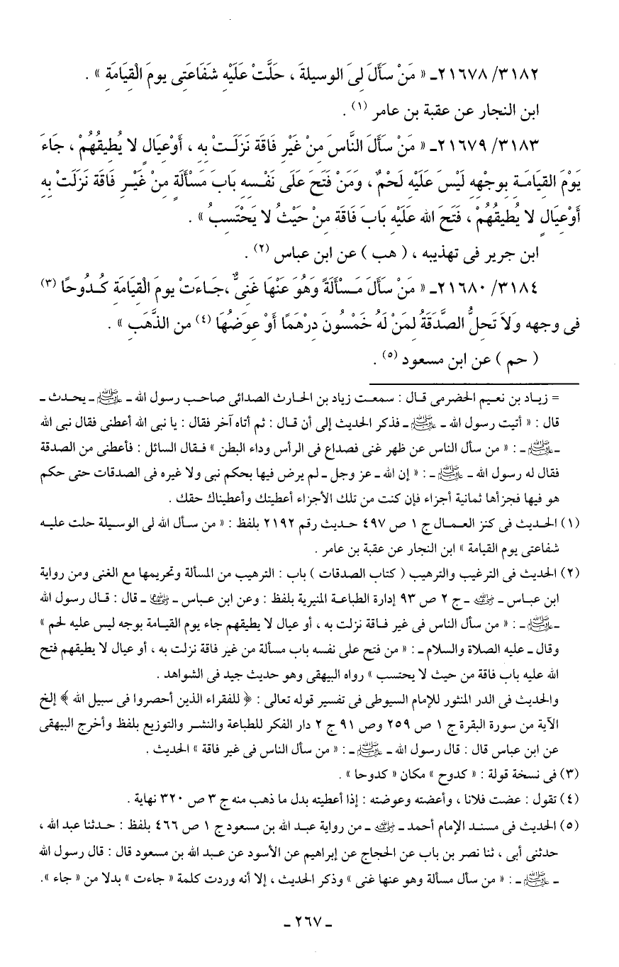 3184/ 21680 - "مَنْ سَأَلَ مَسْأَلَةً وَهُوَ عَنهَا غَنِيٌّ، جَاءَتْ يومَ الْقِيَامَةِ كُدُوحًا (¬3) في وجهه وَلَا تَحِلُّ الصَّدَقَةُ لِمَنْ لَهُ خَمْسُونَ دِرْهَمًا أَوْ عِوَضُهَا (¬4) من الذَّهَبِ".