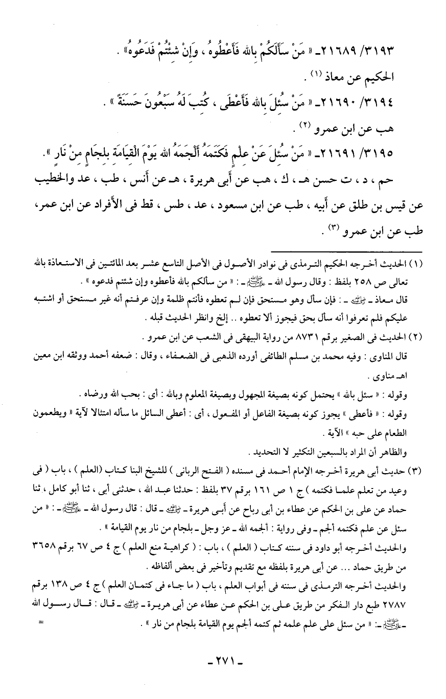 3195/ 21691 - "مَنْ سُئِلَ عَنْ عِلمٍ فَكَتَمَهُ أَلْجَمَهُ الله يَوْمَ الْقِيَامَةِ بلِجَامٍ مِنْ نَارٍ".