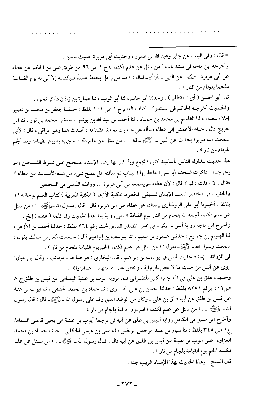 وأخرج ابن عدي في الكامل رواية قيس بن طلق عن أبيه في ترجمة أيوب بن عتبة أبي يحيى قاضى اليمامة ج 1 ص 345 بلفظ: ثنا سيار بن عبد الرحمن الرخس، ثنا علي بن عيسى الجكانى، حدثنا حماد بن محمد الغزاوى عن أيوب بن عتبة عن قيس بن طلق عن أبيه قال: قال رسول الله - صلى الله عليه وسلم -: "من سئل عن علم فكتمه ألجم يوم القيامة بلجام من نار".