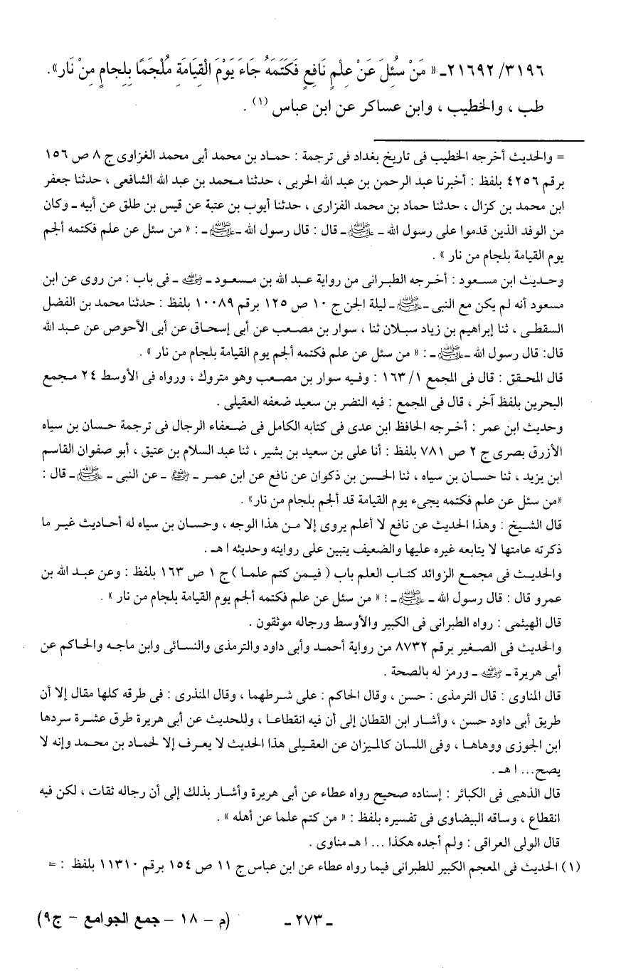 3196/ 21692 - "مَنْ سُئِلَ عَنْ عِلْمٍ نَافِعٍ فَكَتَمَهُ جَاءَ يَوْمَ الْقِيَامَةِ مُلْجَمًا بِلِجامٍ مِنْ نَار".